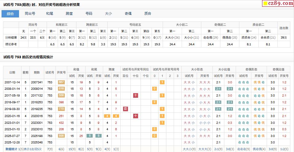> 348期福彩3D试机号753对应开奖号的组选分析结果